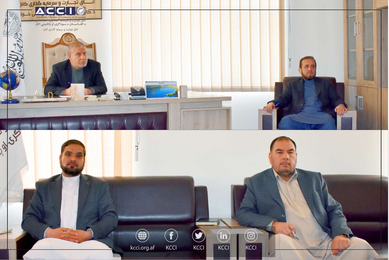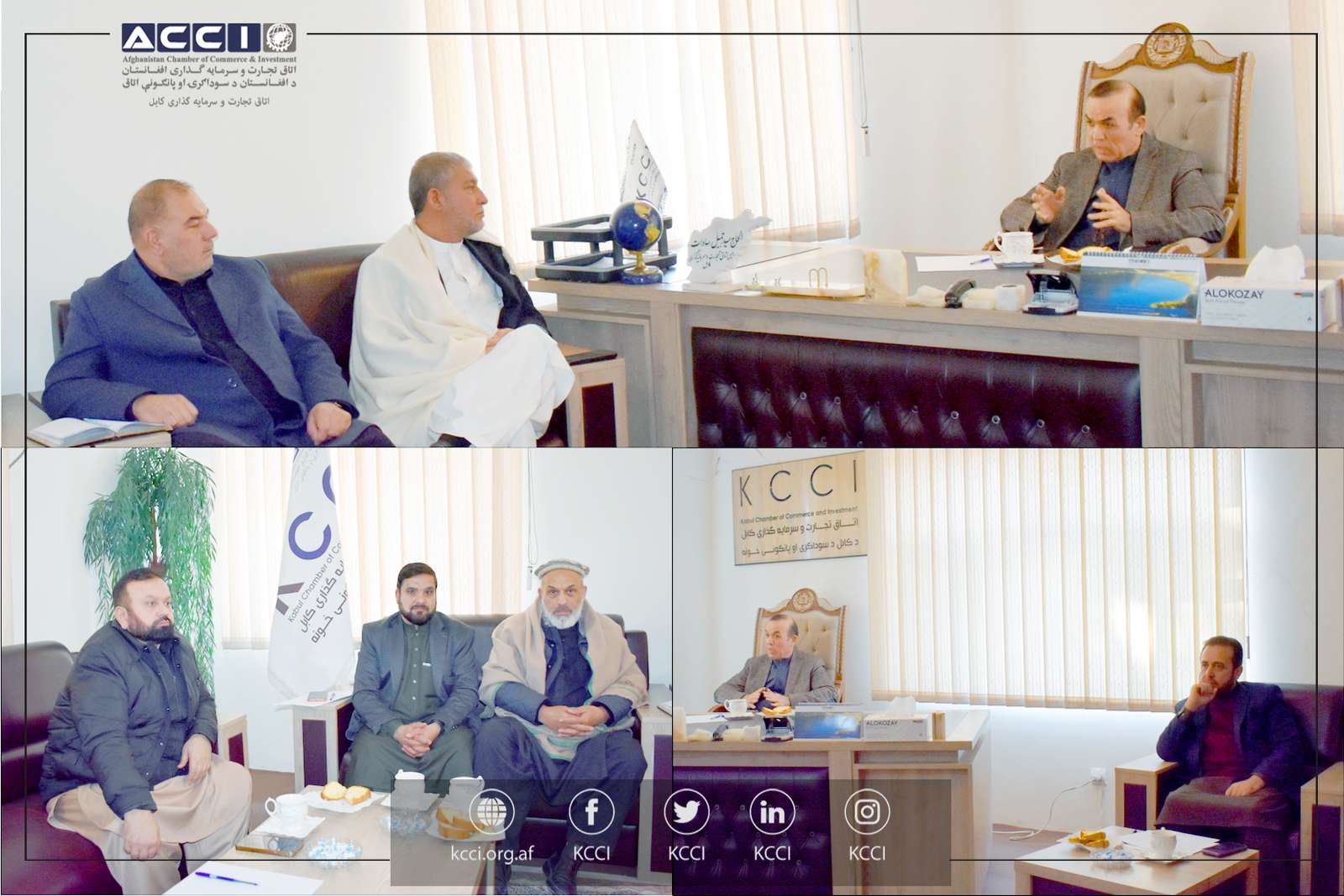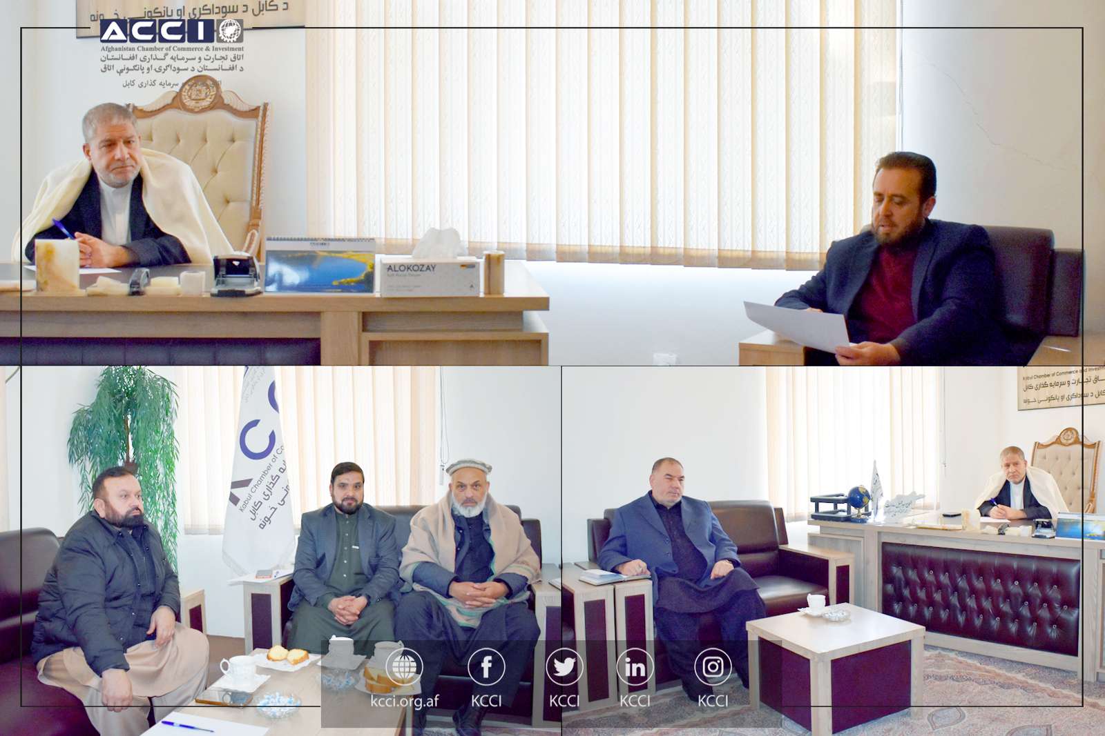 The Seventeenth meeting of the third term of the Executive Committee of the Kabul Chamber of Commerce and Investment was held under the chairmanship of Mr. Sayed Jamil Sadat, Chairman of the Board of Directors with the participation of Mr. Ahmad Shah Hakimi, Vice Chairman; Mr. Homayon Khowajazada, Deputy Commercial; Mr. Abdul Jalil Harif, Deputy Investment of BoD of KCCI; and Mr. Ghulam Sakhy Mohammadi, Chief Executive Officer of the Chamber.