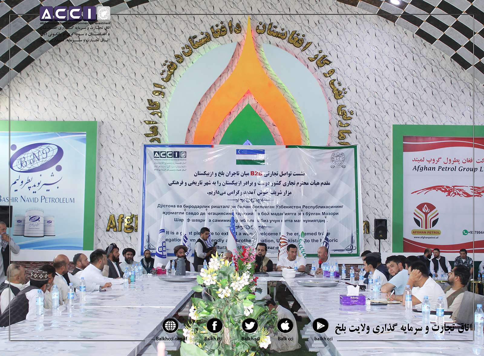 بتاریخ 13 اسدی سالجاری، ولایت بلخ میزبان یک هیأت بلندپایه تجاری از جمهوری ازبکستان بود. این هیأت متشکل از ۴۵ تن از تاجران و سرمایهگذاران برجسته به رهبری آقای تاشمتوف بهادر، معاون اتاق تجارت و صنایع ازبکستان و آقای ملکاوف یارکین جان، رئیس اتحادیه صادرکنندگان ازبکستان بودند